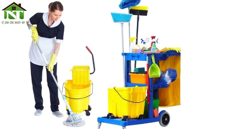 - Dụng cụ vệ sinh chuyên dụng như: chổi, cây lau nhà, bàn chài, móc chữ D dành cho công việc lau kính trên cao,….
