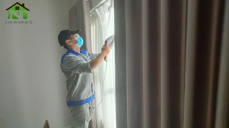 Phương pháp giặt bằng hơi nóng là một trong những cách hiệu quả để làm sạch rèm cửa. Nam Tín sử dụng