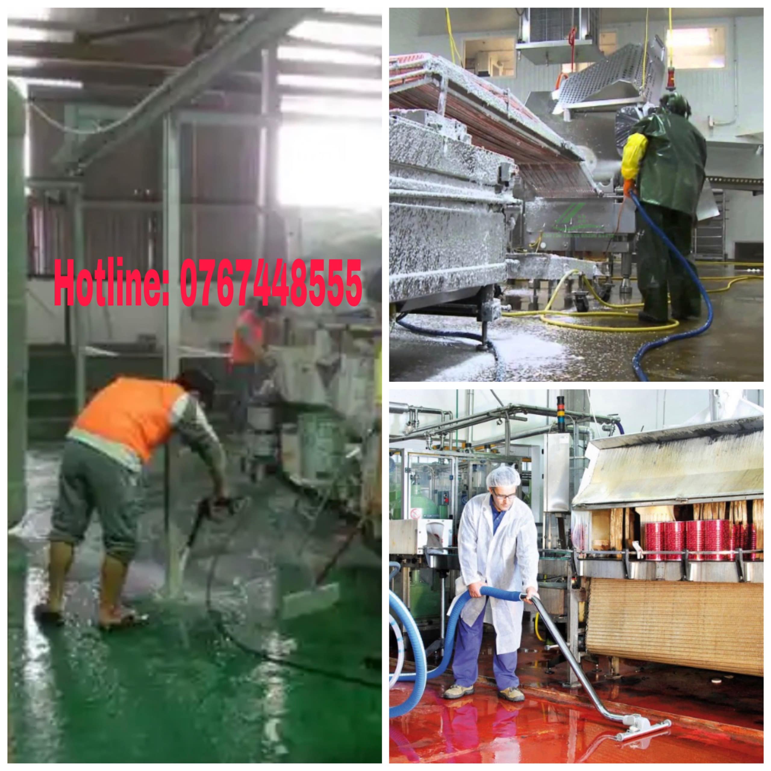 Toàn bộ các công đoạn làm sạch như trần, sàn, vách, máy móc có trong nhà xưởng.